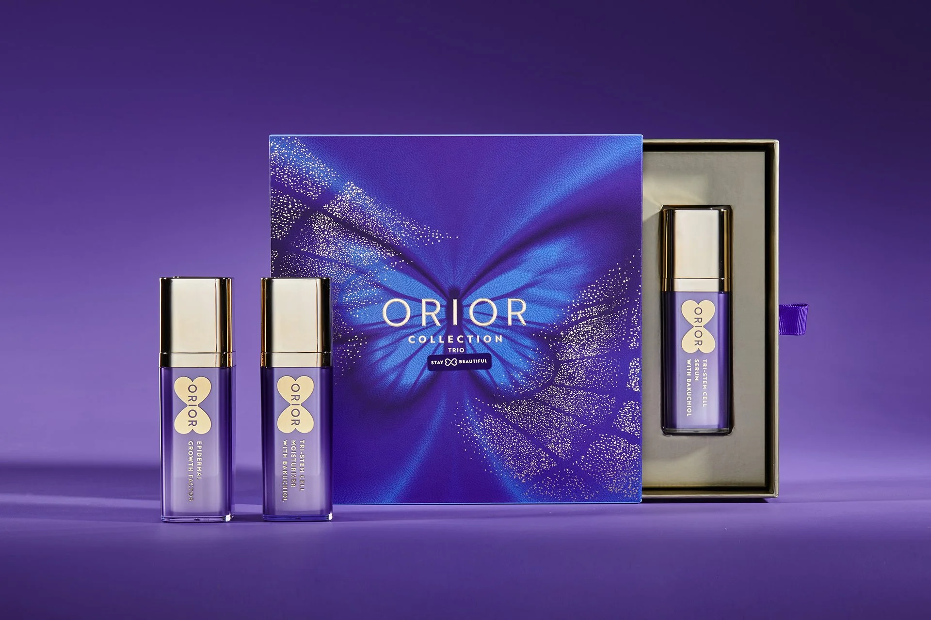 This established brand aimed to elevate its image to reflect sophistication and premium quality. Bold graphics and vibrant colors, centered on a symbolic butterfly, express transformation, growth, and self-care. Gold accents and foil add elegance, while translucent materials and a soft purple-blue gradient evoke freshness and purity.